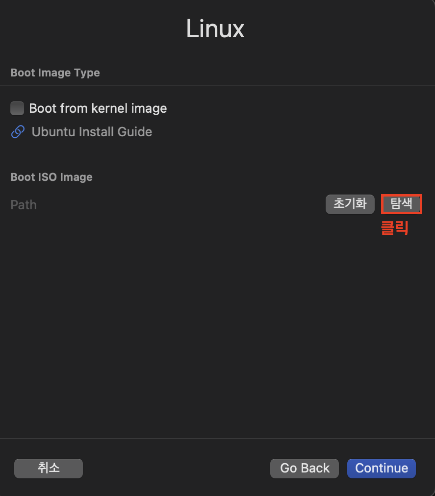 6. 탐색을 눌러 위에서 다운 받은 iso이미지를 넣어준다.