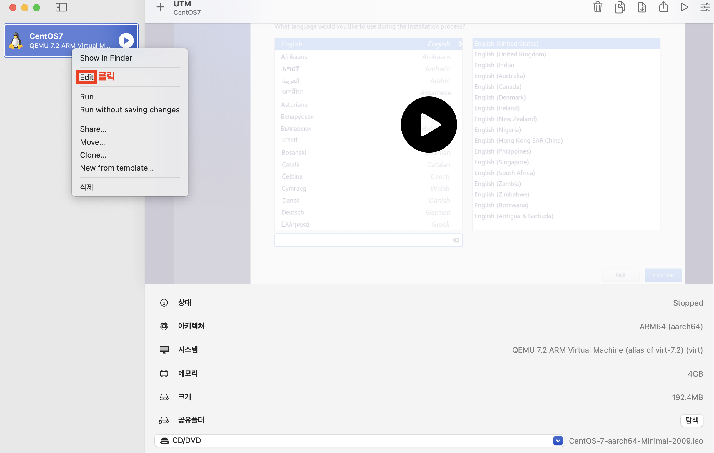 1. UTM에서 해당 CentOS 7 VM 종료하기