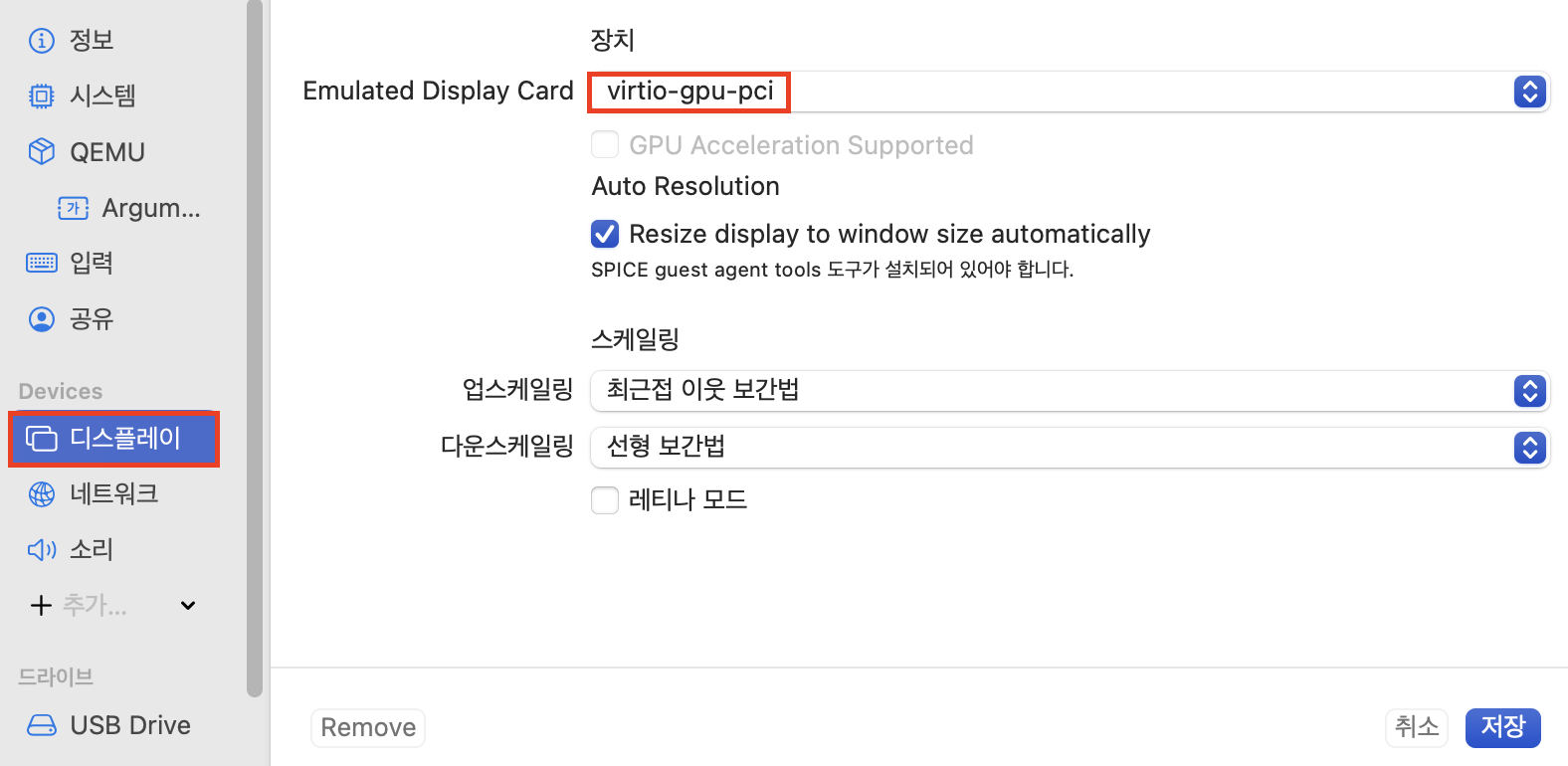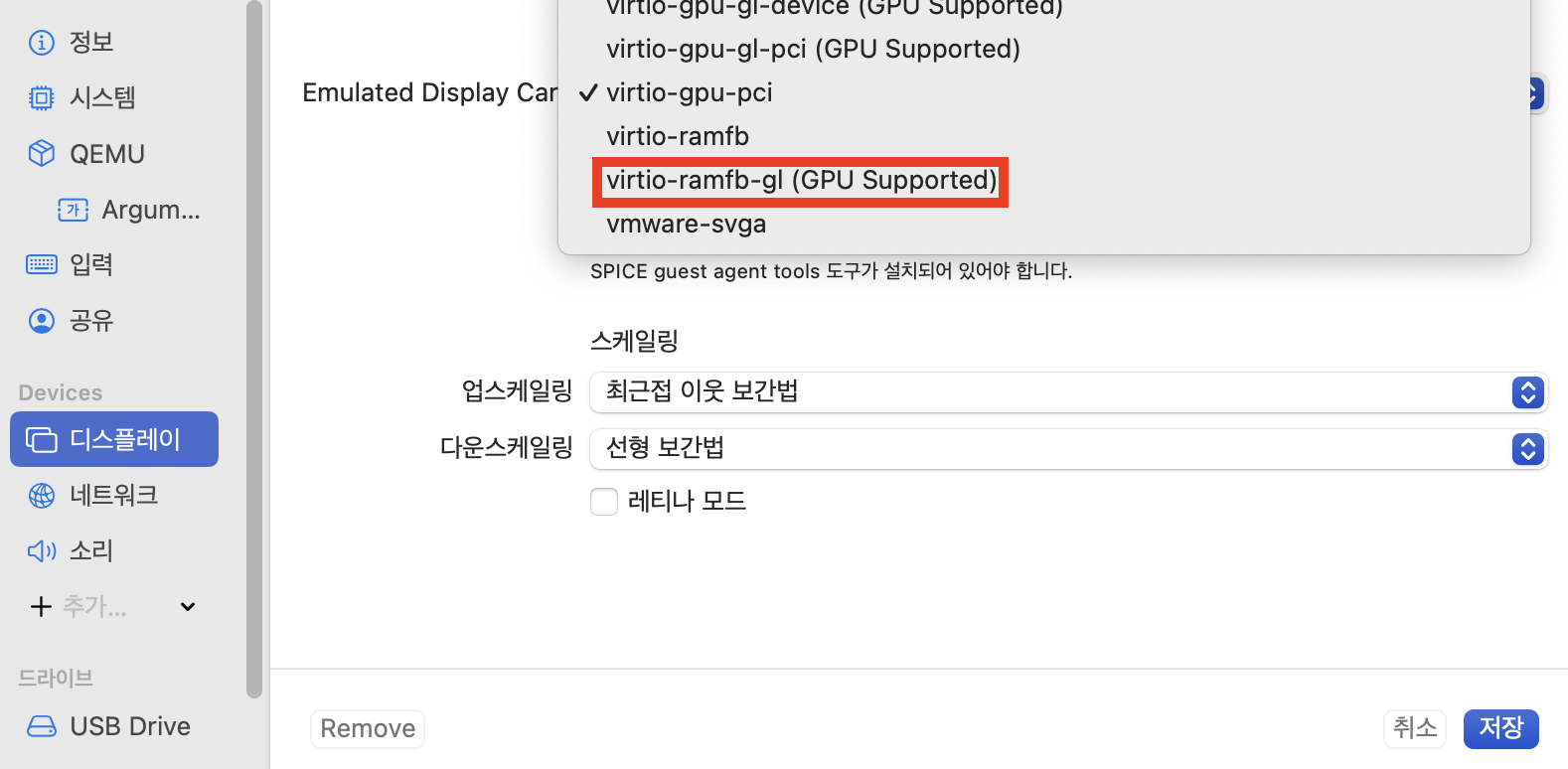 Emulated Display Card를 virtio-ramfb-gl (GPU supported) 또는 Display (GPU) 등으로 변경