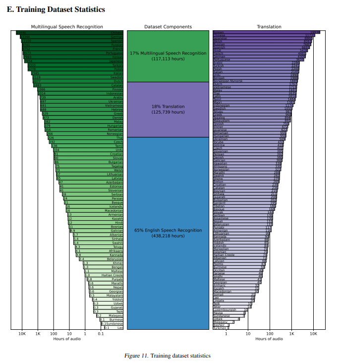 아래 그림은 Whisper 논문에서 공개한 훈련 데이터 구성과 언어별 분포를 보여줍니다.